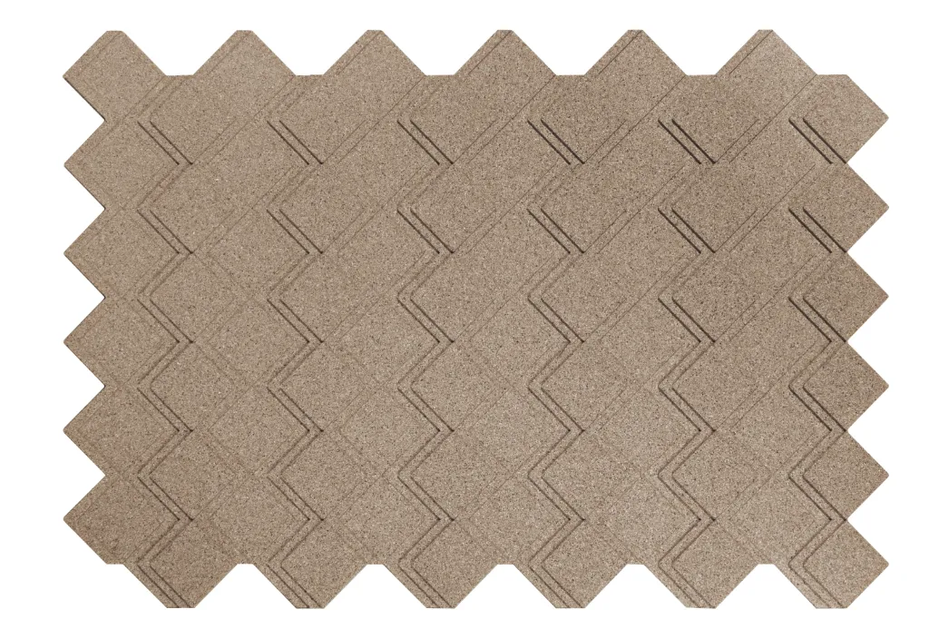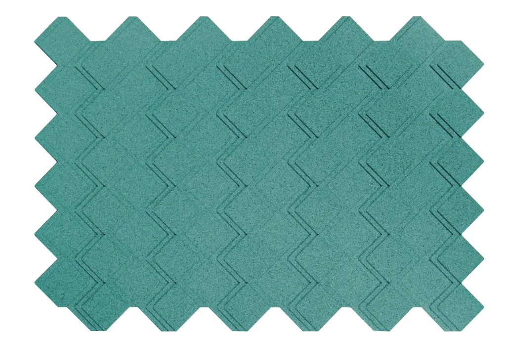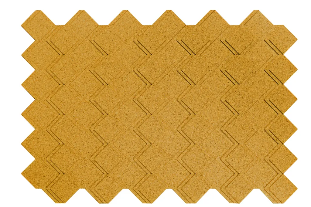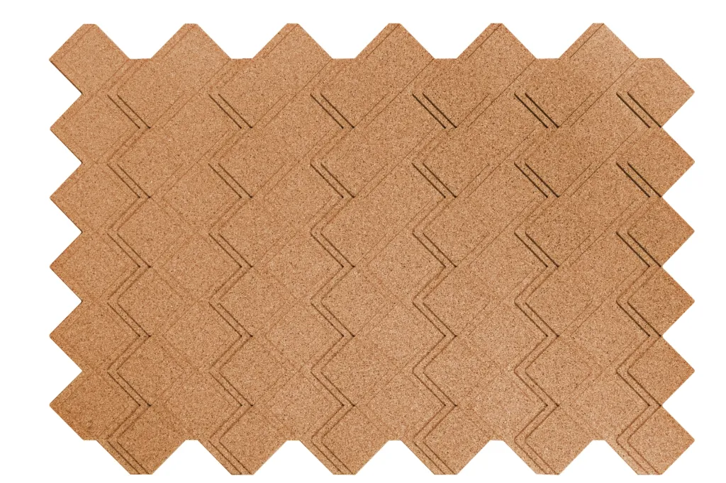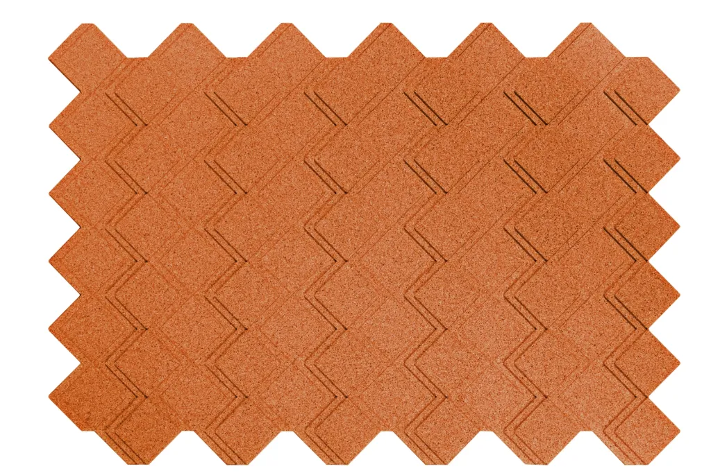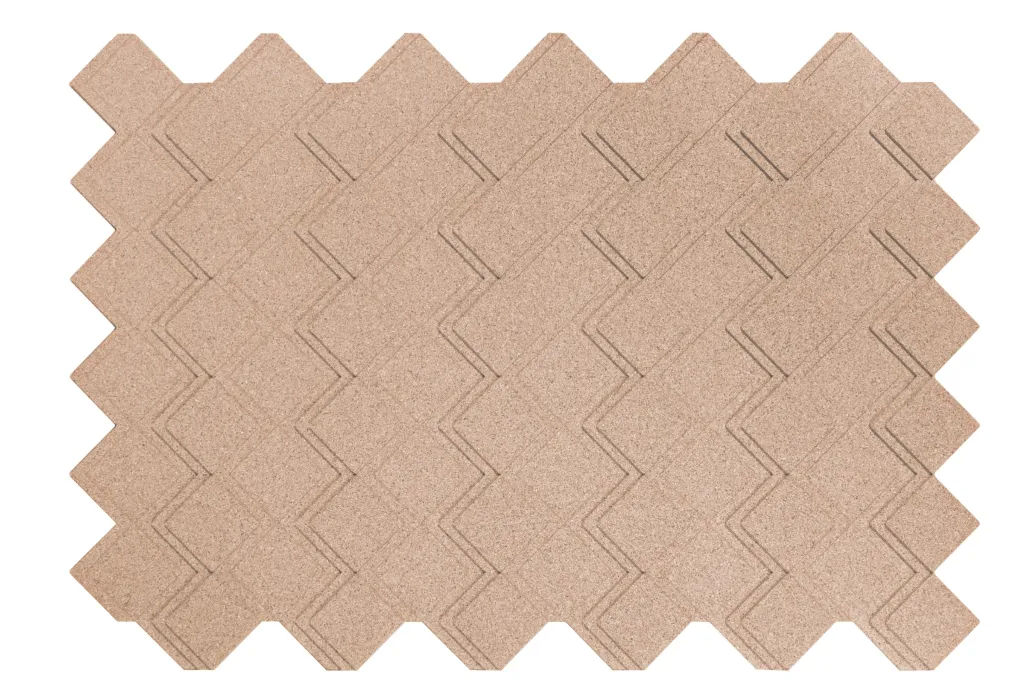 Peças maciças de cortiça aglomeradas com resinas e aditivos especiais, moldadas com pigmentação de cor na massa.